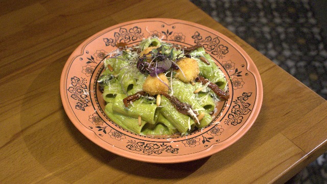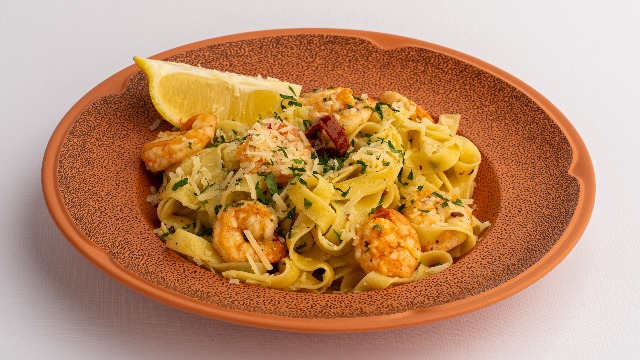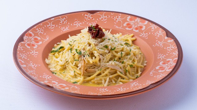 Spaghetti, turkey ham, onions, carbonara sauce and Parm...