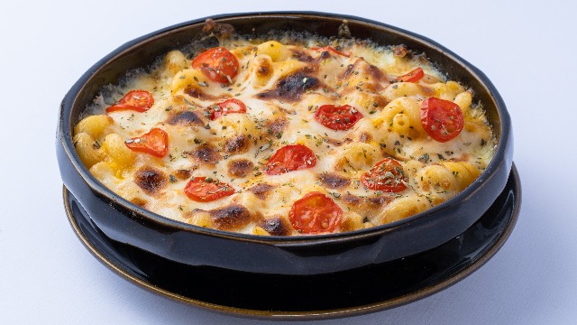 Macaroni pasta prepared in a creamy cheese sauce, onion...