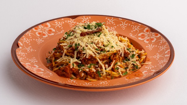 Spaghetti, traditional beef mince ragu, with italian to...